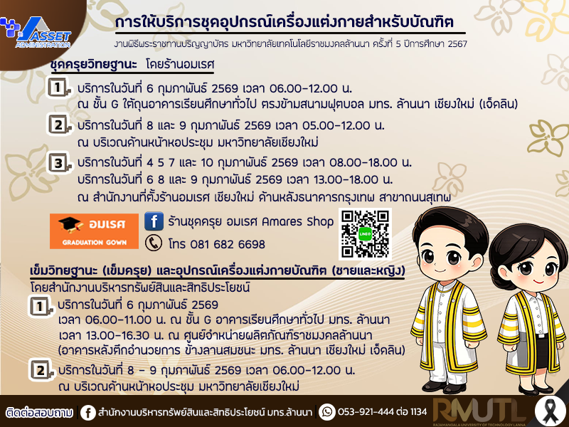 การให้บริการชุดอุปกรณ์เครื่องแต่งกายสำหรับบัณฑิต ในงานพิธีพระราชทานปริญญาบัตร มหาวิทยาลัยเทคโนโลยีราชมงคลล้านนา ครั้งที่ 5 ปีการศึกษา 2567